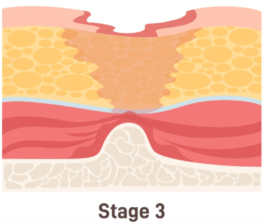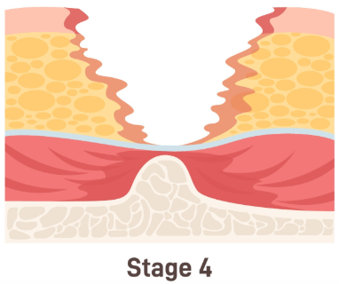 3등급 | ![]() | - 피부 전층의 손상 - 피부 및 조직의 괴사가 있으나 근막까지는 도달하지 않은 상태 |