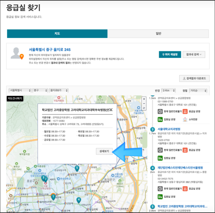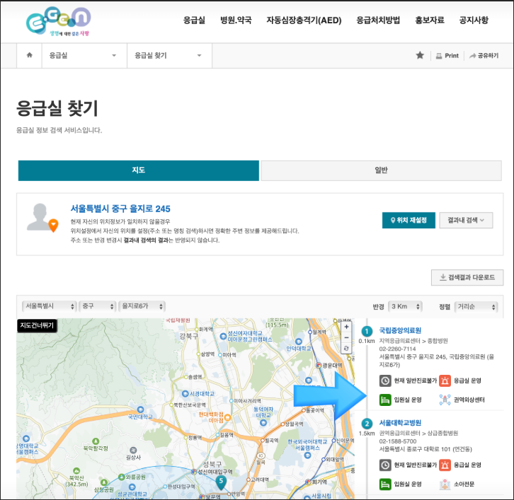 접속주소 : 응급실 찾기-지도 | E-GEN통합홈페이지 (클릭시 “응급실찾기”페이지로 이동)